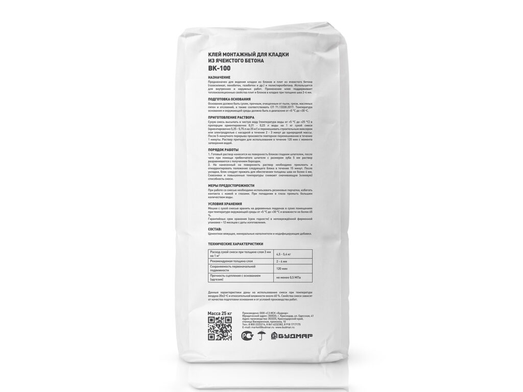 - Клей монтажный для изделий из ячеистого бетона БУДМАР ВК-100