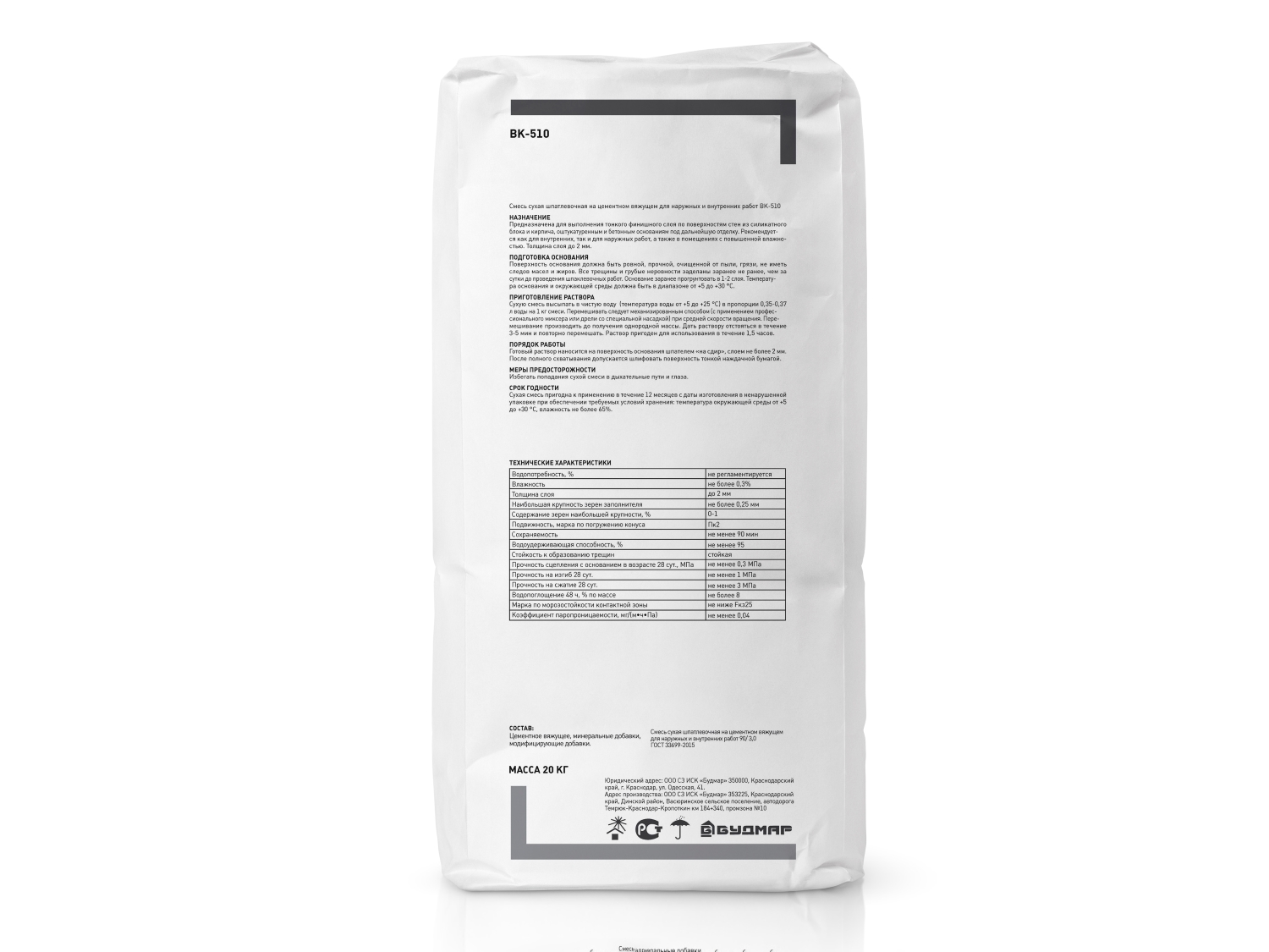 - Смесь сухая шпаклевочная финишная цементная БУДМАР ВК-510
